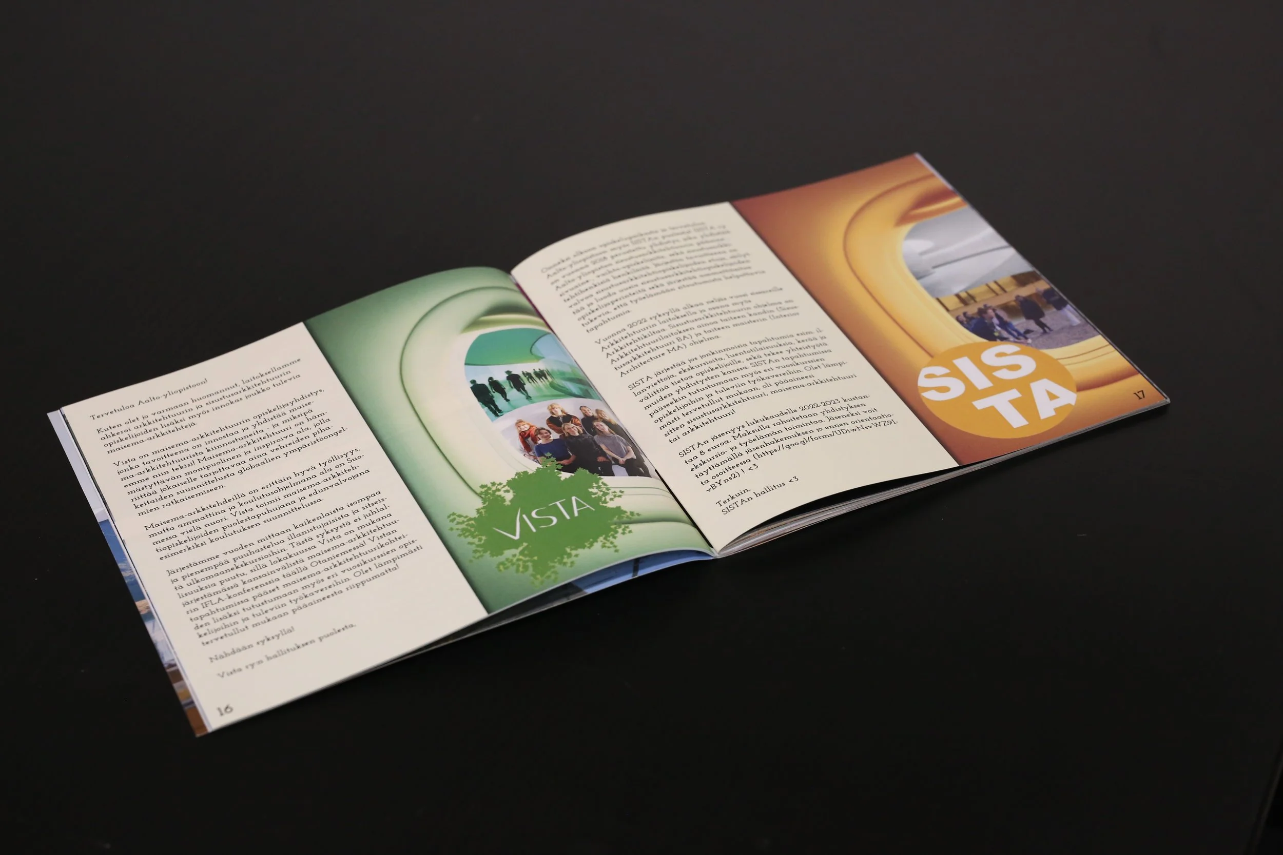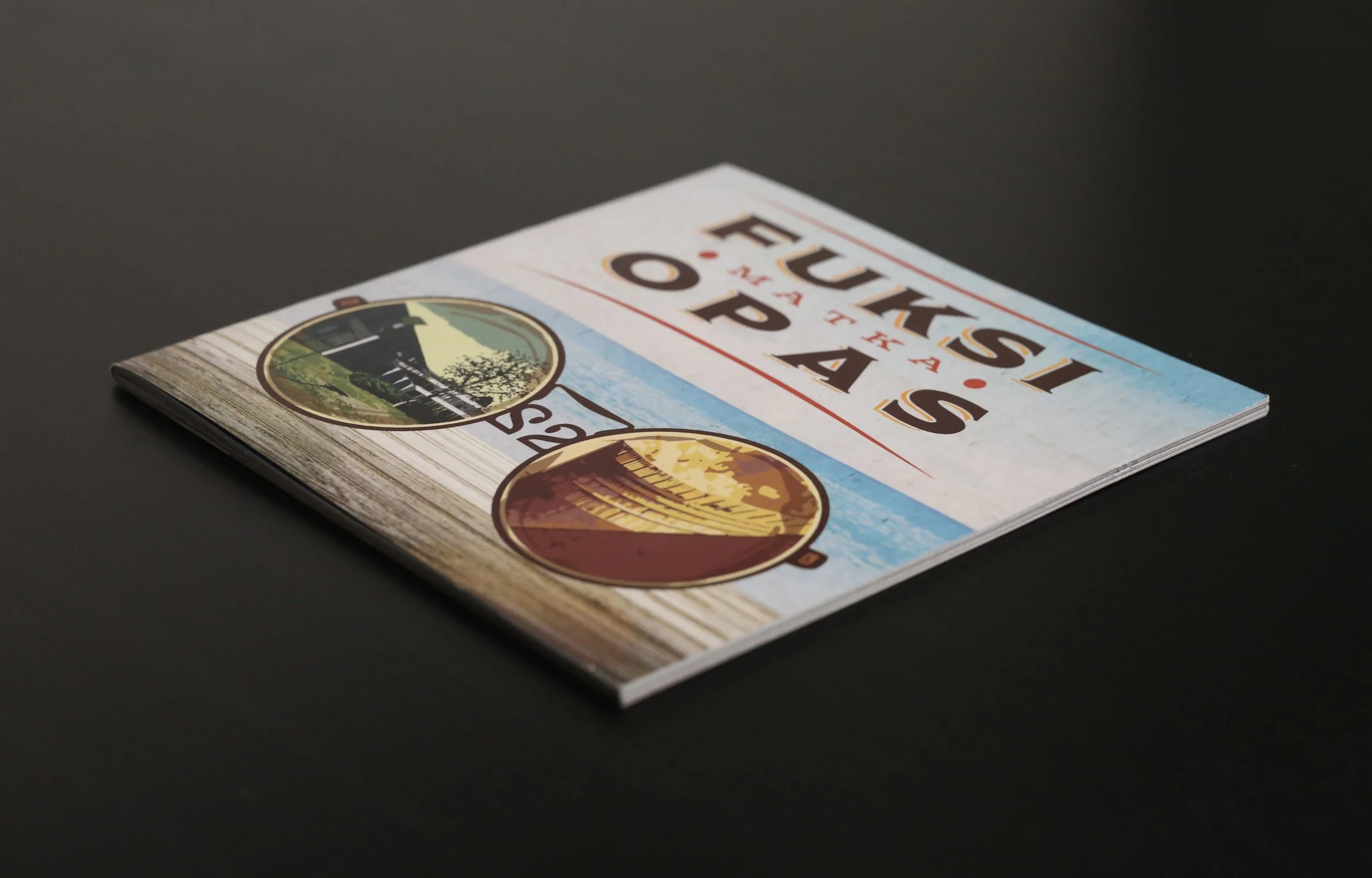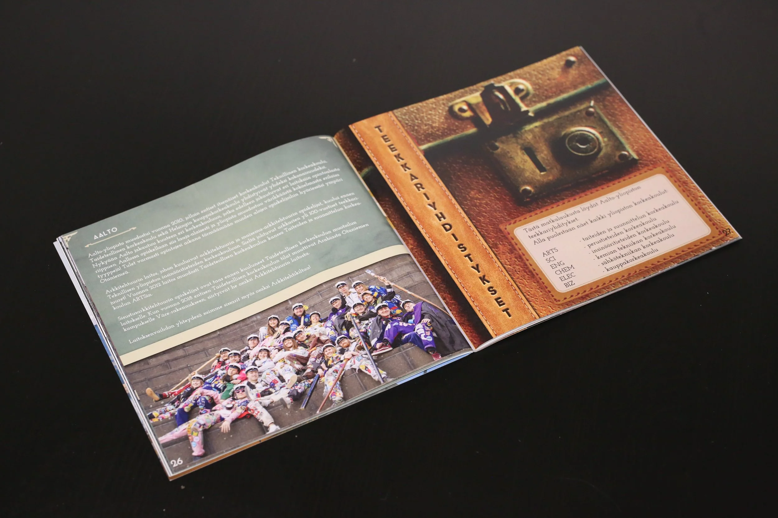 Lopulliseksi ilmeeksi päätyi matkaopas teemainen vihko, jossa yhtenäinen teema kantaa läpi koko oppaan.