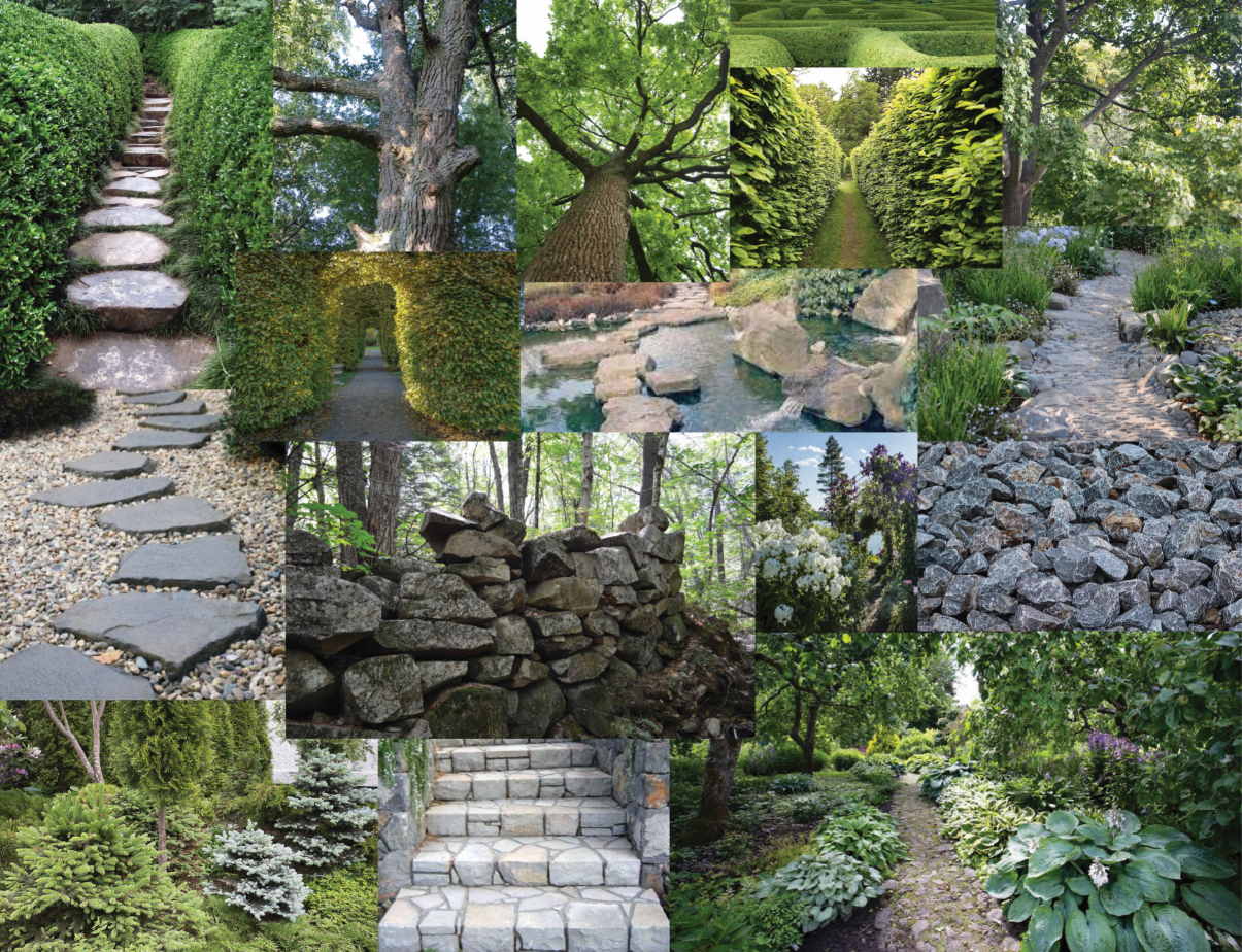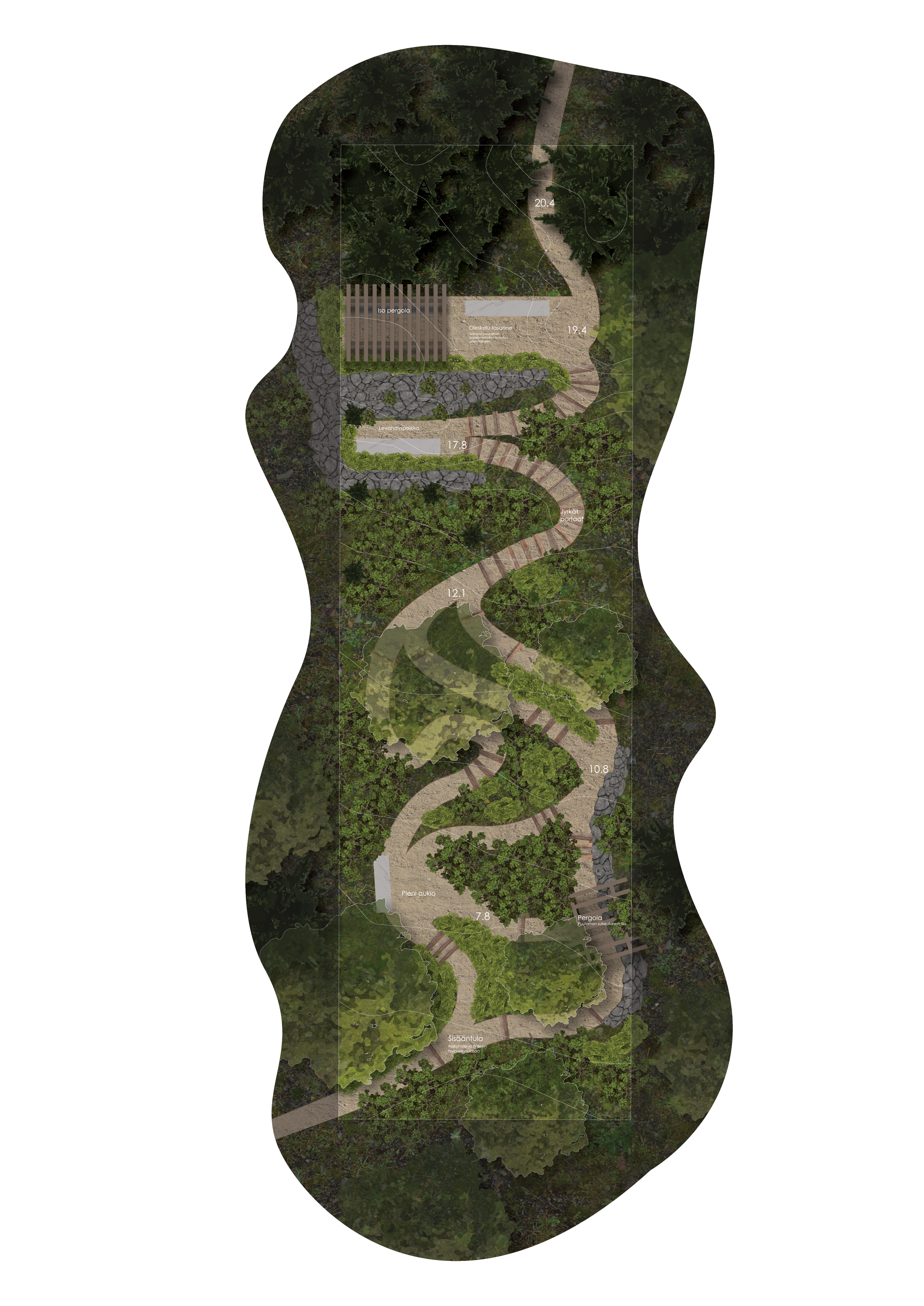 Puutarhan muotoihin on haettu inspiraatiota labyrinteistä. Toteutuksessa on kuitenkin huomioitu näkölinjat niin, ettei puutarhassa kävijä koe oloaan eksyneeksi. Rinteen päälle on asetettu pergola, joka toimii sekä kiintopisteenä että levähdyspaikkana vierailijoille.