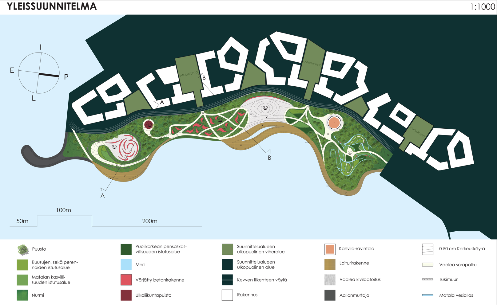 Suunnitelmassa on panostettu sektorien tilallisiin eroihin sekä toimintojen erotteluun tarpeeksi etäälle toisistaan, jotta puistosta ei muodostuisi yhtenäistä massaa. Näin kokonaisuus pysyy kävijälle mielenkiintoisena.