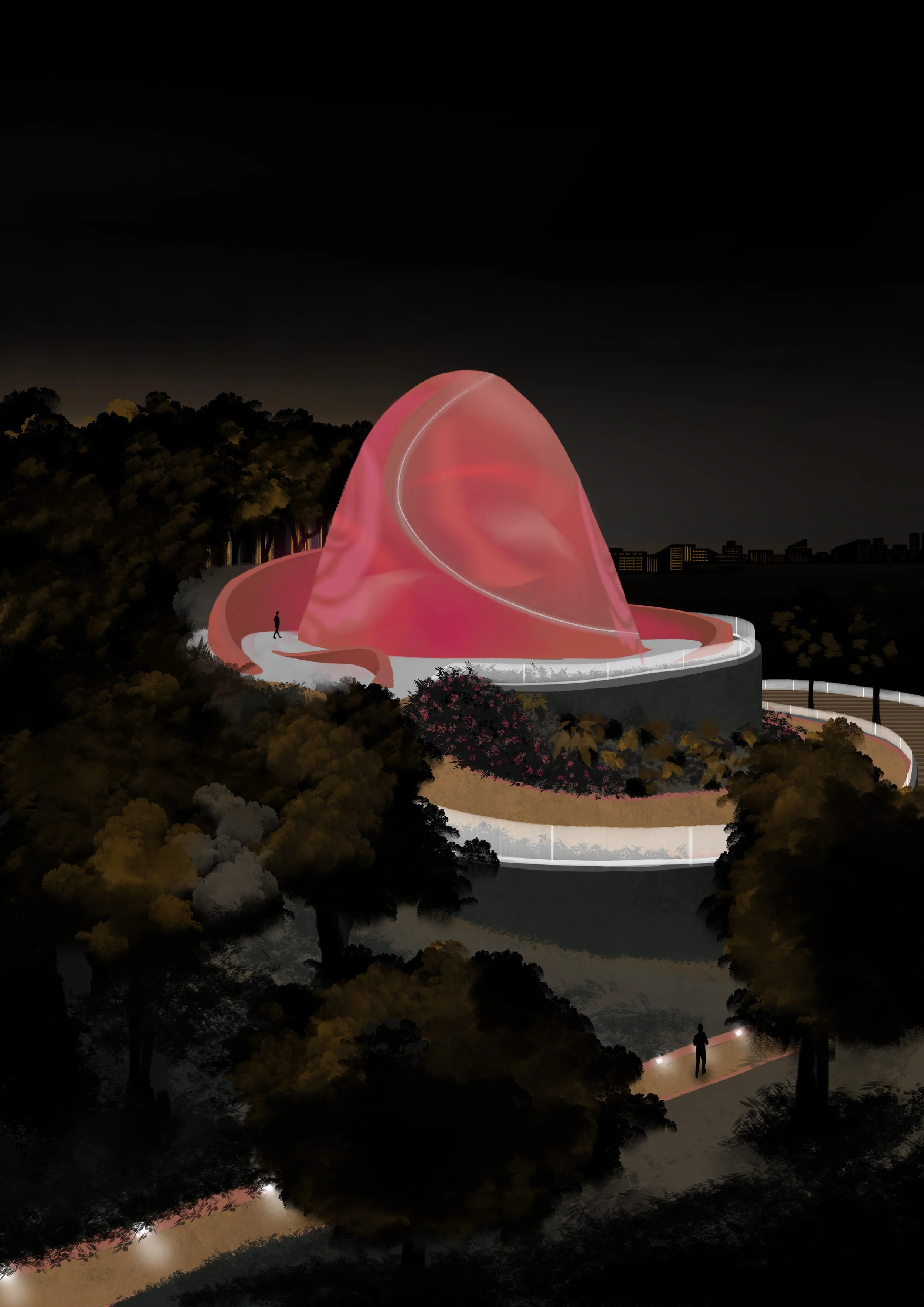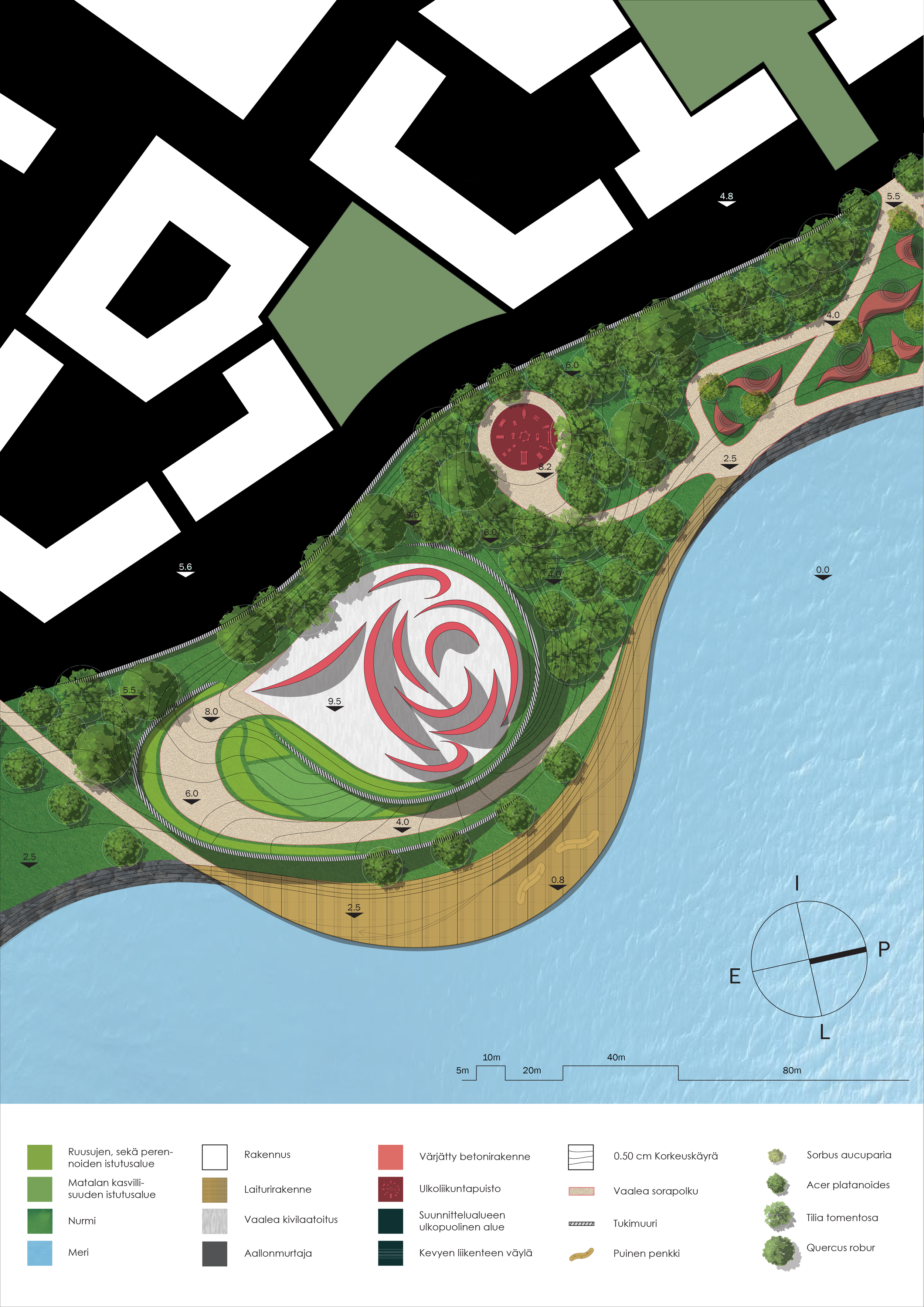 Suunnitelmani tavoitteina oli luoda puistolle kohokohta, joka erottuisi selkeästi jo kaukaa muusta massasta paljastamatta itsestään vielä kaikkea. Matkalla kohti horisontissa häämöttävää Silmua kävijälle on ripoteltu vihjeitä tulevasta.